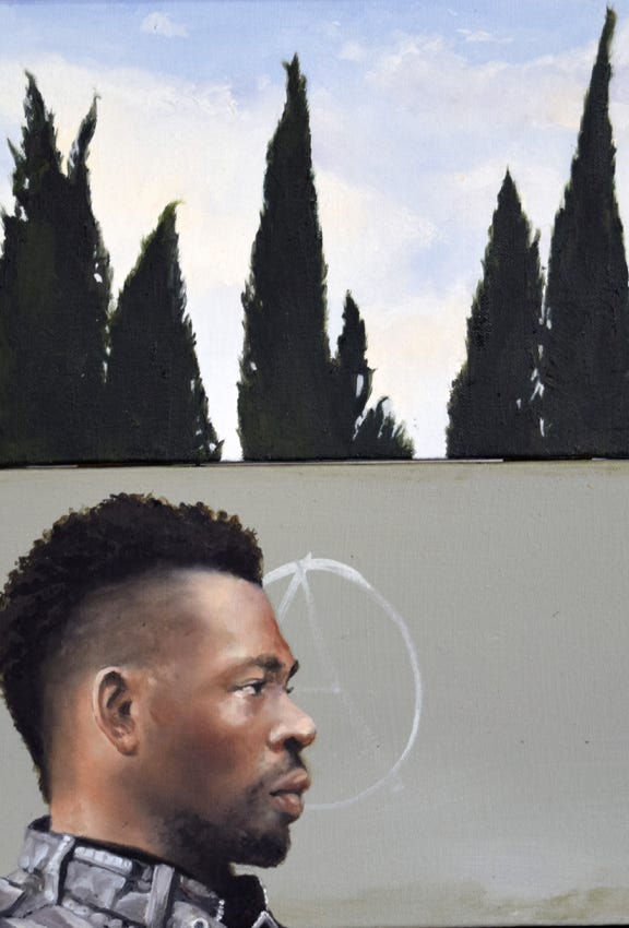 Rather than traditional portraiture, Stevens' subjects act as representatives of broader types. However, all his subjects are people he knows personally - friends, family, or casual acquaintances - which adds a layer of individual identity to what might otherwise be anonymous stereotypes. The figures are typically set against sparse backgrounds suggestive of decaying urban landscapes, with additional imagery introduced to enhance the narrative.